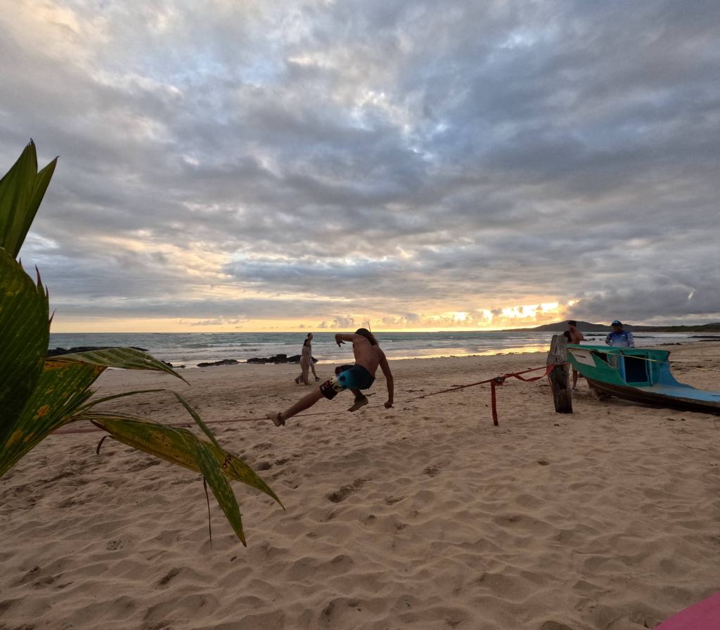 Three local brothers were leaping and twisting on a slack line just for fun, the light on the waves fading to gold, bottles clinking to loud “Salud!” toasts and laughter.